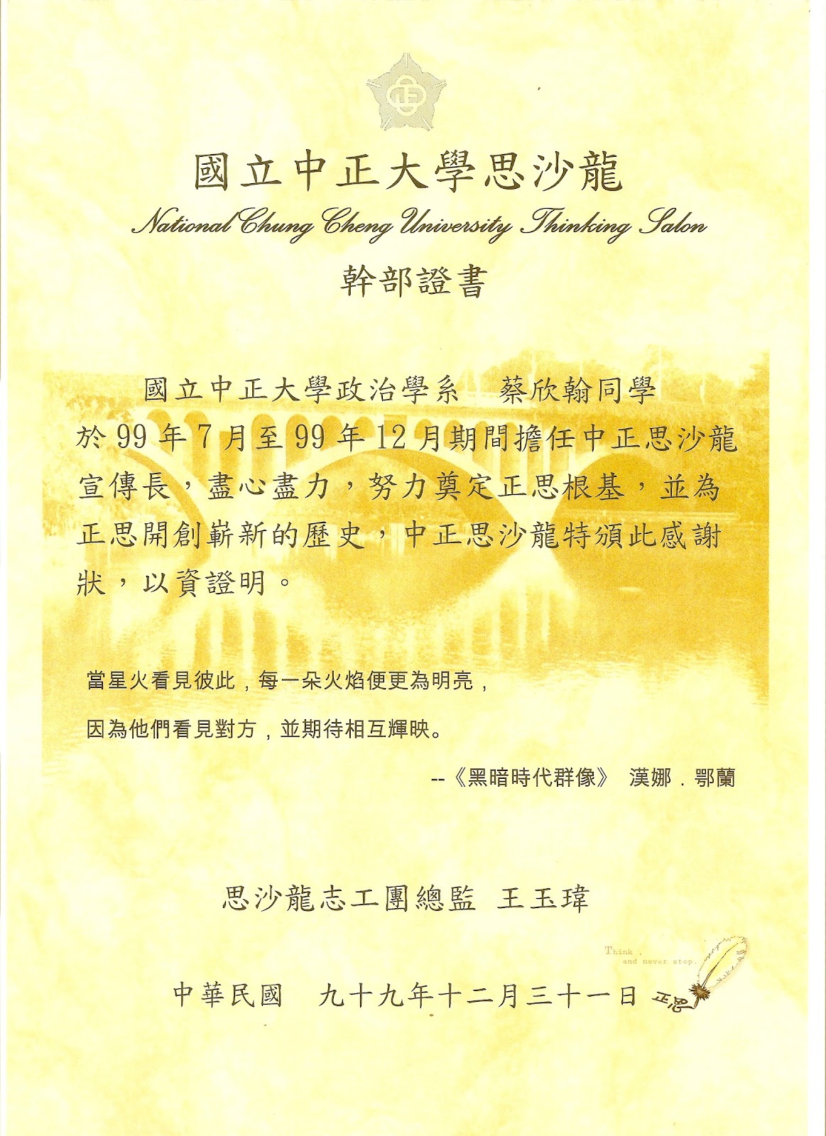 在這裡面真的認識了好多很厲害的人,非常的投入與堅持,對於一種思考與實踐的探討,似乎唯有在大學的時期,能這樣對現有的社會勇敢提出不同的見解與聲音。